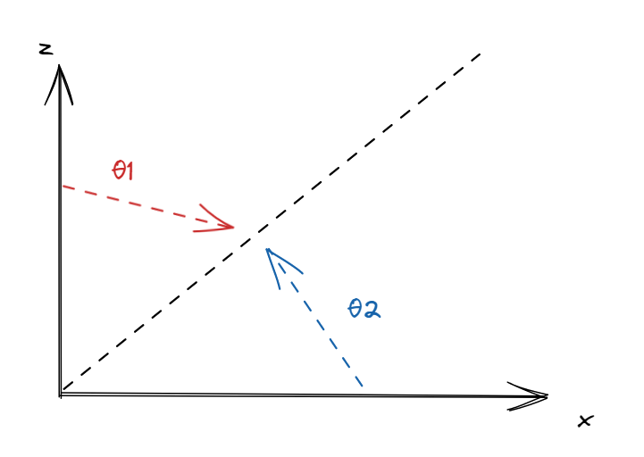 两者关于 \(\frac\pi 4\) 对称. 满足关系 \(\theta_1+\theta_2=\frac \pi 2+2k\pi\) (不知道应该怎么推导, 我归纳出来的)